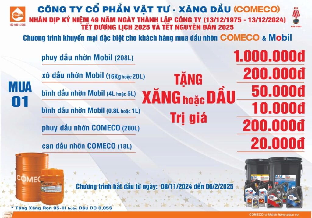 Công ty Cổ phần Vật tư – Xăng dầu (COMECO) kính gửi đến quý khách hàng Chương trình khuyến mại dành cho khách hàng mua dầu nhờn Mobil và COMECO nhân dịp kỷ niệm 49 năm Ngày thành lập Công ty (13/12/1975 – 13/12/2024), Tết Dương lịch 2025 và Tết Nguyên đán 2025.